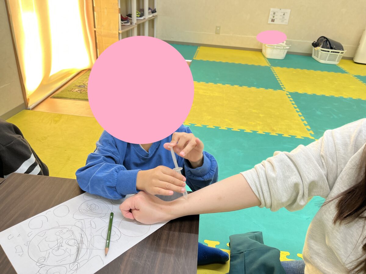 低学年のお友達はまだまだ注射を見るのも怖いことから今日は注射に触って楽しんでもらいました!