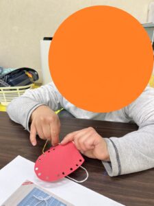 今回は台紙を手袋型にし、白い毛糸で縁取るようにひもを通してもらいました\(^o^)/