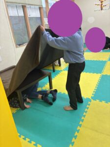 隠れられるスペースがないので、パーテーションや布団など様々な道具を駆使してみんなに隠れてもらいました(*´ω`*)