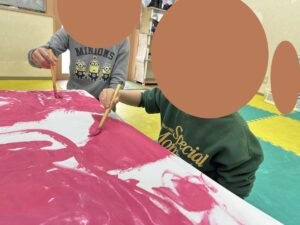 最初は真っ白だった模造紙も鮮やかなピンクに!塗り忘れがないようみんなで丁寧に塗ることが出来ました👏