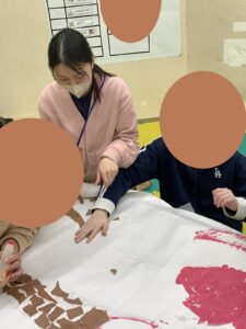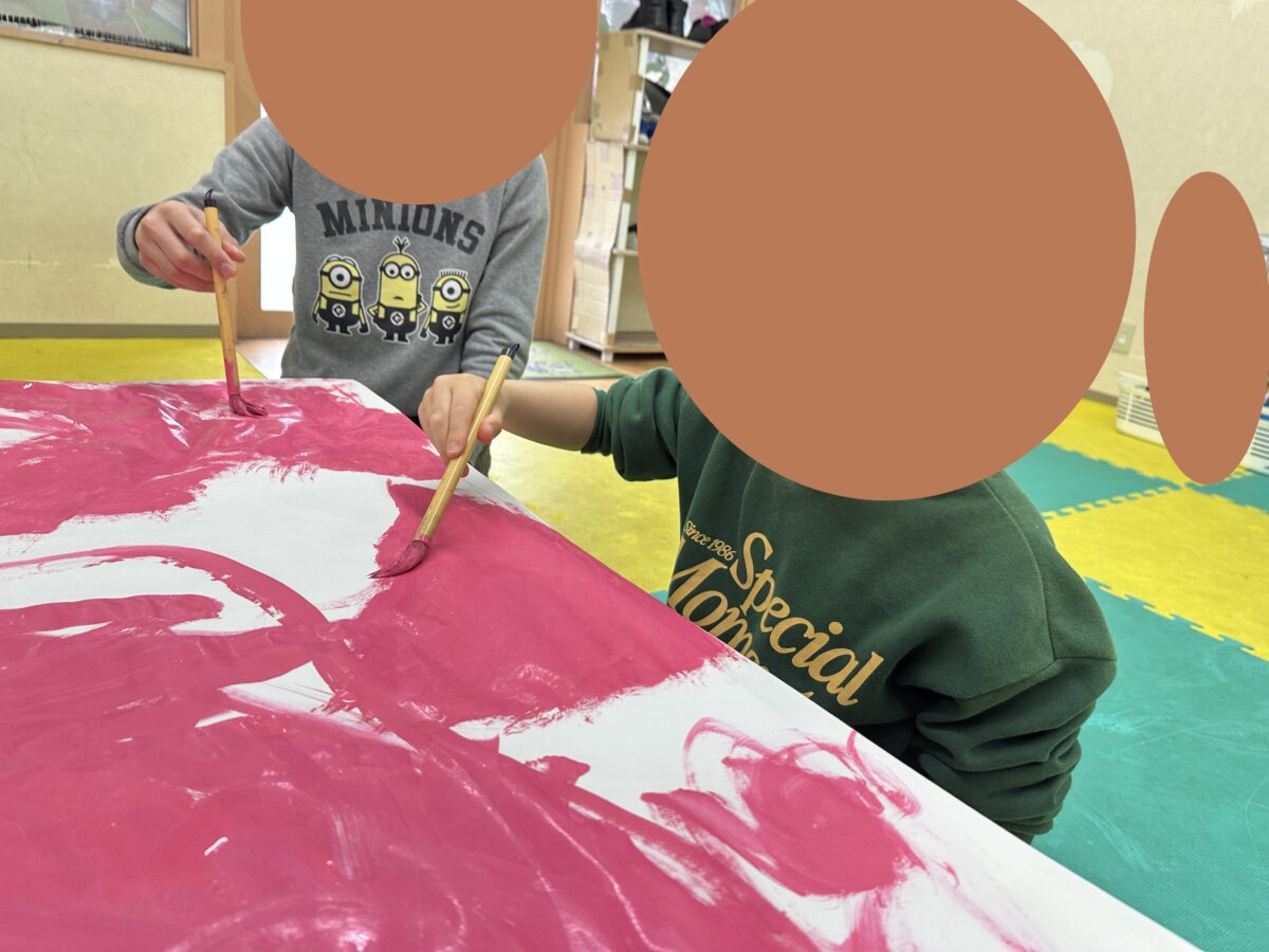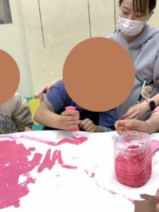 絵具を使って絵を描くのが好きなお友達が多いようで、みんなで交代しながら桜色を塗り広げていきます!