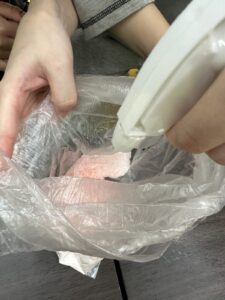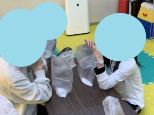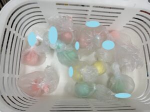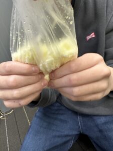今回は1人1個自分用に作ってもらうので、1人1枚ポリ袋を持ってもらい、そこへ材料を入れていきます!