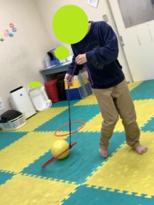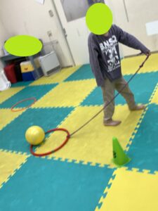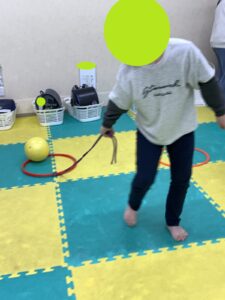 さて、今週の運動遊びの最後に“ボール散歩”というメニューがあります!ひもをつないだフープの中にボールを入れて、逃さないように進みます!!