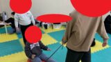 まだ立つ事が難しいお友達は、スタッフの足に座ってボールの感覚を掴みます(^-^)