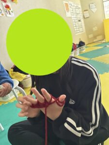 それでも作品を作りたいお友達はスタッフと相談し、指編みで編み物を行いました!