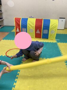 このしゃがむ姿勢が苦手なお友達が多く、お尻が上がってしまったり首だけ下げてかがむ姿勢のお友達もいるため、しゃがめる姿勢までプールスティックを下げておこなっています。