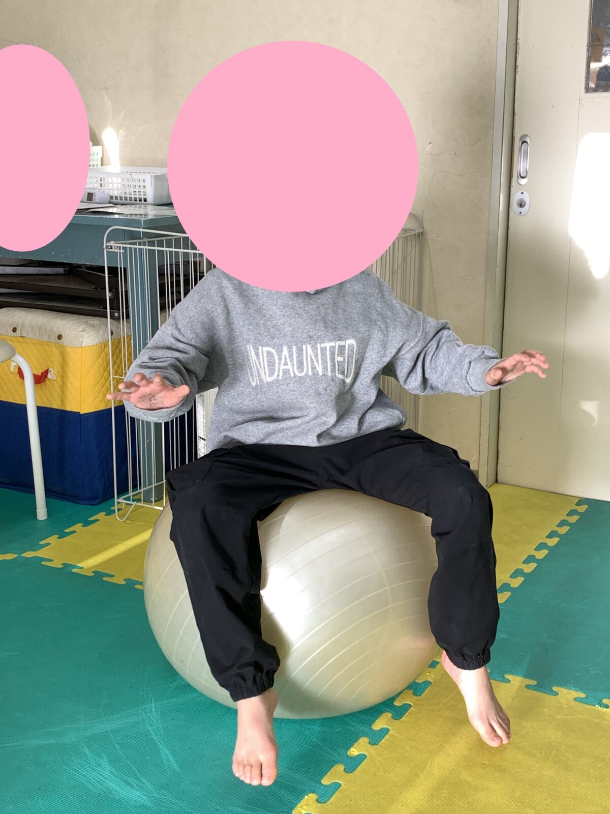 ピーナッツ型ではなく、丸いタイプのバランスボールなので難易度はいつもより高いですよ~!