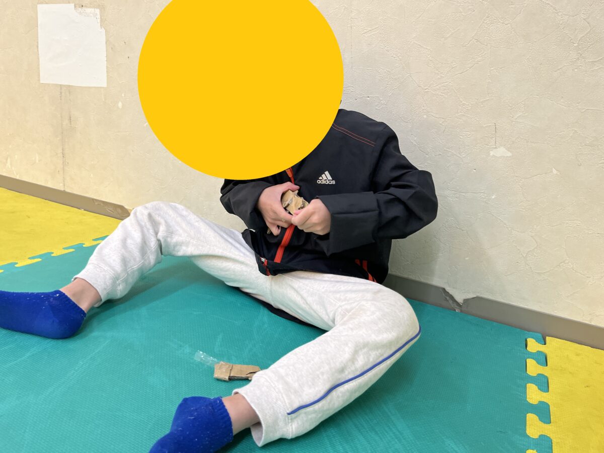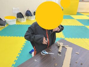 こちらのお友達は段ボールの切れ端を使って輪ゴムの銃を作成中…!