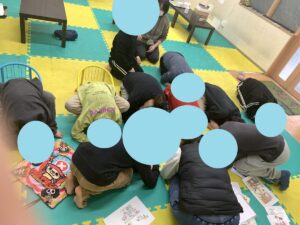 その後は地震についての絵本を読みます!お家はもちろん、学校、スーパー、公園などで地震が起きた時はどうするか、そんな話をみんなで聞きました👂