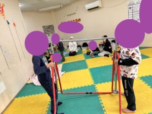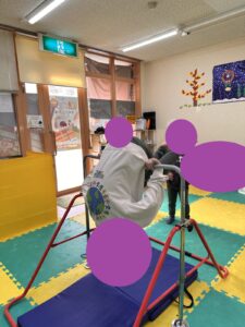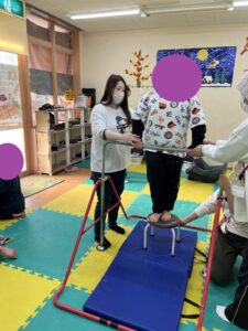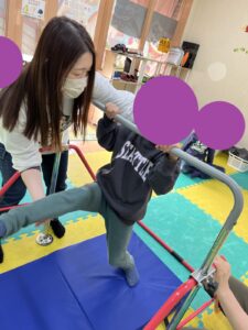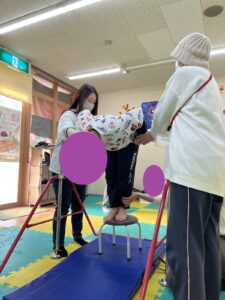 そんなお友達はまず椅子を使って立ち、鉄棒に寄りかかる所から慣れていきます!